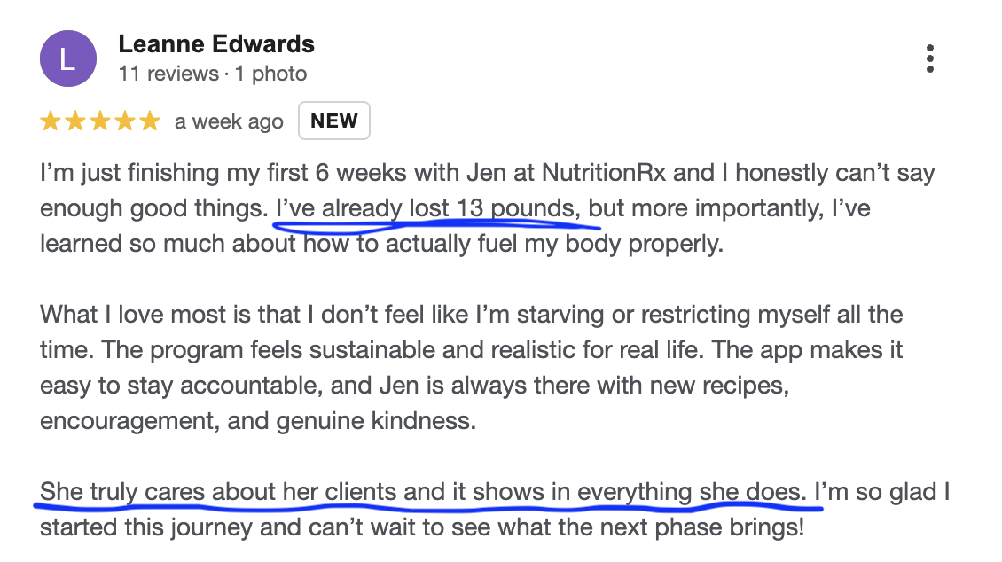 “I’m just finishing my first 6 weeks with Jen at NutritionRx and I honestly can’t say enough good things. I’ve already lost 13 pounds.” (March 3)