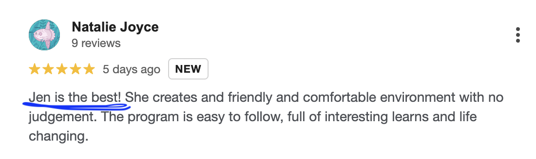 “Jen is the best! She creates a friendly and comfortable environment with no judgment.” (March 4)